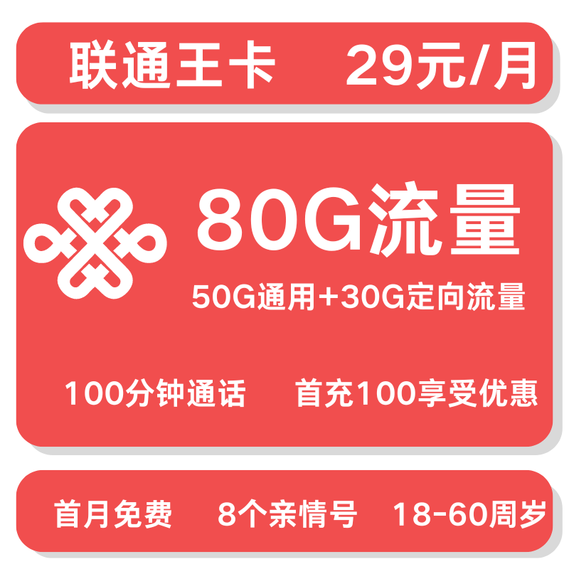 联通王卡29元80G+100分钟【全国发货】