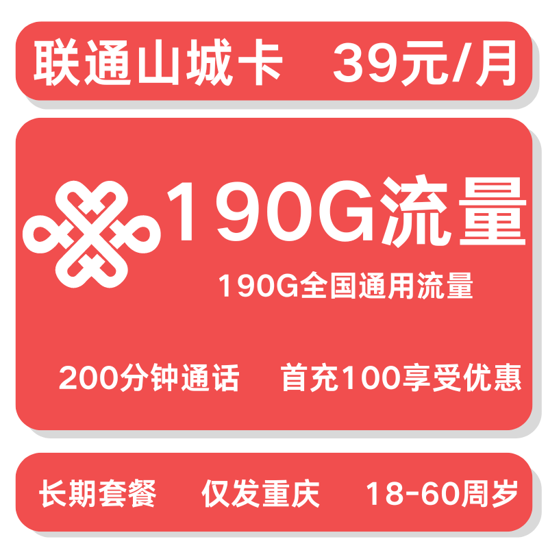 联通山城卡39元190GB+200分钟【仅发重庆】